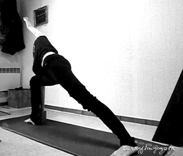 Ici, la cale à l’extérieur du pied dans utthita parsvakonasana (posture de l’angle étiré) évite que le bassin s’effondre vers le tapis 😉